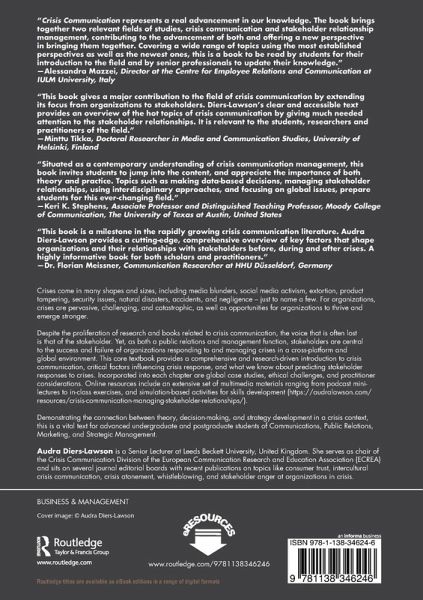 Crises come in many shapes and sizes, including media blunders, social media activism, extortion, product tampering, security issues, natural disasters, accidents, and negligence - just to name a few. For organizations, crises are pervasive, challenging, and catastrophic, as well as opportunities for organizations to thrive and emerge stronger. Despite the proliferation of research and books related to crisis communication, the voice that is often lost is that of the stakeholder. Yet, as both a public relations and management function, stakeholders are central to the success and failure of organizations responding to and managing crises in a cross-platform and global environment. This core textbook provides a comprehensive and research-driven introduction to crisis communication, critical factors influencing crisis response, and what we know about predicting stakeholder responses to crises. Incorporated into each chapter are global case studies, ethical challenges, and practitioner considerations. Online resources include an extensive set of multimedia materials ranging from podcast mini-lectures to in-class exercises, and simulation-based activities for skills development (https://audralawson.com/resources/crisis-communication-managing-stakeholder-relationships/). Demonstrating the connection between theory, decision-making, and strategy development in a crisis context, this is a vital text for advanced undergraduate and postgraduate students of Communications, Public Relations, Marketing, and Strategic Management.