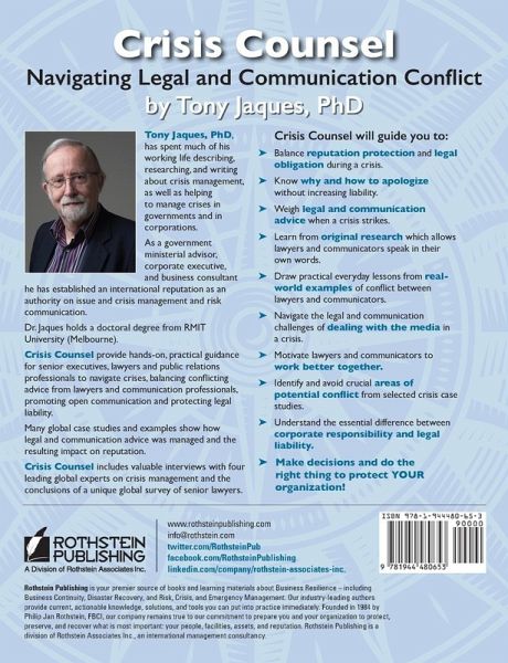 The book will help you to: Balance reputation protection and legal obligation during a crisis. Know why and how to apologize without increasing liability. Weigh legal and communications advice when a crisis strikes. Learn from original research which lets lawyers and communicators speak in their own words. Draw practical everyday lessons from real-world examples of conflict between lawyers and communicators. Navigate the legal and communication challenges of dealing with the media in a crisis. Motivate lawyers and communicators to work better together. Identify and avoid crucial areas of potential conflict from selected crisis case studies. Understand the essential difference between corporate responsibility and legal liability. Make decisions and do the right thing to protect your organization. This book is designed to provide hands-on, practical guidance for senior executives, lawyers and public relations professionals to navigate crises and to balance conflicting advice from lawyers and communication professionals while promoting open communication and protecting legal liability. The book includes a wide variety of global case studies and examples while analyzing how legal and communications advice was managed and the impact on reputation. Crisis Counsel also includes interviews with four of the leading global experts on crisis management and the conclusions of a focused, unique global survey of senior lawyers.