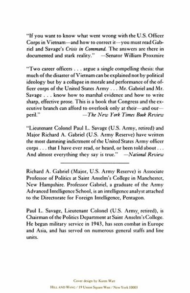 Crisis in Command, written in the aftermath of the Vietnam War, details the mismanagement of the US Army's leadership. Former soldiers Richard A. Gabriel and Paul L. Savage provide documented evidence that the military forces of the United States are ill-prepared for war, having been weakened by officer-corps members who have abandoned honor and integrity to further their individual careers.