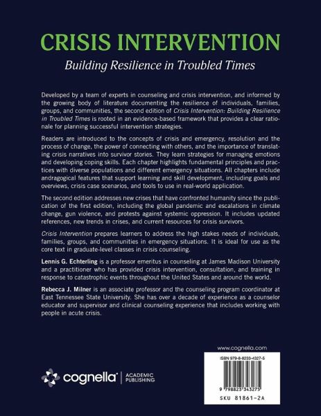 Developed by a team of experts in counseling and crisis intervention, and informed by the growing body of literature documenting the resilience of individuals, families, groups, and communities, the second edition of Crisis Intervention: Building Resilience in Troubled Times is rooted in an evidence-based framework that provides a clear rationale for planning successful intervention strategies. Readers are introduced to the concepts of crisis and emergency, resolution and the process of change, the power of connecting with others, and the importance of translating crisis narratives into survivor stories. They learn strategies for managing emotions and developing coping skills. Each chapter highlights fundamental principles and practices with diverse populations and different emergency situations. All chapters include andragogical features that support learning and skill development, including goals and overviews, crisis case scenarios, and tools to use in real-world application. The second edition addresses new crises that have confronted humanity since the publication of the first edition, including the global pandemic and escalations in climate change, gun violence, and protests against systemic oppression. It includes updated references, new trends in crises, and current resources for crisis survivors. This user-friendly text provides straight forward skills and techniques that readers can readily use in a variety of professional settings. Crisis Intervention prepares learners to address the high stakes needs of individuals, families, groups, and communities in emergency situations. It is ideal for use as the core text in graduate-level classes in crisis counseling. Prerequisite completion of courses in counseling theories and techniques is recommended for students using this text.