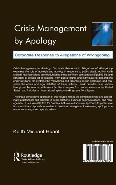 Whether it is a President who must apologize to the nation, a company that has developed a product that has caused a grievous harm, or a celebrity trying to repair a damaged image, apologia and apologies are frequently in the news. "Crisis Management by Apology: Corporate Response to Allegations of Wrongdoing" examines the role of apology in response to public attack. It considers all topics, from public figures and individuals to corporations and government. The book explores such topics as the ethics and the legal liabilities of apologies. Case studies are featured in throughout, including an international example for apology making from Japan. The broad-perspective approach taken in the text gives the book greater relevance to practitioners and a diverse appeal. This book will be of interest to scholars and practitioners in public relations, business communications, and business and management. It is appropriate for use as a supplemental book in courses using a rhetorical approach to public relations and crisis communication. It will also appeal to readers in business management areas, examining apology as a corporate response to crises.