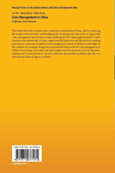 Introduction: Governance transformation and crisis management in China in the transitional era.- The fundamental concepts of crises and crisis management.- The chronology of constructing a modern crisis management system.- The organizational behaviors to construct a modern crisis management system.- The Decision making processes to construct a modern crisis management system.- A comparative analysis of European and American Construction of a modern crisis management system.- An analysis of China in constructing a modern crisis management system.