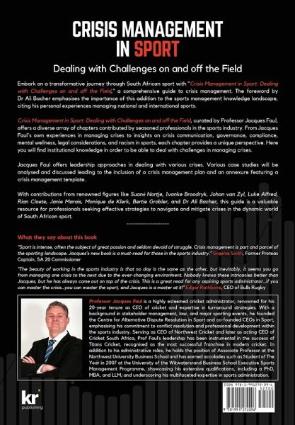 Embark on a transformative journey through South African sport with " Crisis Management in Sport: Dealing with Challenges on and Off the Field," a comprehensive guide to crisis management. The foreword by Dr. Ali Bacher emphasizes the importance of this addition to the sports management knowledge landscape, citing his personal experiences managing national and international sports. Crisis Management in Sport: Dealing with Challenges on and Off the Field, curated by Professor Jacques Faul, offers a diverse array of chapters contributed by seasoned professionals in the sports industry. From Jacques Faul's own experiences in managing crises to insights on crisis communication, governance, compliance, mental wellness, legal considerations, and racism in sports, each chapter provides a unique perspective. Here you will find institutional knowledge in order to be able to deal with challenges in managing crises. Jacques Faul offers leadership approaches in dealing with various crises. Various case studies will be analysed and discussed leading to the inclusion of a crises management plan and an annexure featuring a crisis management template. With contributions from renowned figures like Suane Nortje, Ivanke Broodryk, Johan van Zyl, Luke Alfred, Rian Cloete, Janie Marais, Monique de Klerk, Bertie Grobler, and Dr. Ali Bacher, this guide is a valuable resource for professionals seeking effective strategies to navigate and mitigate crises in the dynamic world of South African sport.