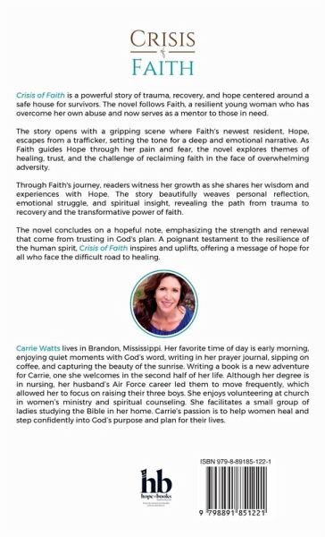 Crisis of Faith is a powerful story of trauma, recovery, and hope centered around a safe house for survivors. The novel follows Faith, a resilient young woman who has overcome her own abuse and now serves as a mentor to those in need. The story opens with a gripping scene where Faith's newest resident, Hope, escapes from a trafficker, setting the tone for a deep and emotional narrative. As Faith guides Hope through her pain and fear, the novel explores themes of healing, trust, and the challenge of reclaiming faith in the face of overwhelming adversity. Through Faith's journey, readers witness her growth as she shares her wisdom and experiences with Hope. The story beautifully weaves personal reflection, emotional struggle, and spiritual insight, revealing the path from trauma to recovery and the transformative power of faith. The novel concludes on a hopeful note, emphasizing the strength and renewal that come from trusting in God's plan. A poignant testament to the resilience of the human spirit, Crisis of Faith inspires and uplifts, offering a message of hope for all who face the difficult road to healing.