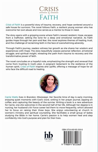 Crisis of Faith is a powerful story of trauma, recovery, and hope centered around a safe house for survivors. The novel follows Faith, a resilient young woman who has overcome her own abuse and now serves as a mentor to those in need. The story opens with a gripping scene where Faith's newest resident, Hope, escapes from a trafficker, setting the tone for a deep and emotional narrative. As Faith guides Hope through her pain and fear, the novel explores themes of healing, trust, and the challenge of reclaiming faith in the face of overwhelming adversity. Through Faith's journey, readers witness her growth as she shares her wisdom and experiences with Hope. The story beautifully weaves personal reflection, emotional struggle, and spiritual insight, revealing the path from trauma to recovery and the transformative power of faith. The novel concludes on a hopeful note, emphasizing the strength and renewal that come from trusting in God's plan. A poignant testament to the resilience of the human spirit, Crisis of Faith inspires and uplifts, offering a message of hope for all who face the difficult road to healing.