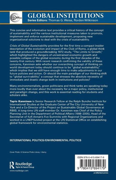 Crisis of Global Sustainability provides for the first time a compact insider description of the evolution and impact of the Club of Rome, a global think tank that produced a groundbreaking 1972 study "The Limits to Growth" which highlighted the dangers of unrestrained economic growth and possible collapse of global economy during the first decades of the 21st century. With recent research confirming the validity of these concerns, Kanninen asks whether our overarching concept of thinking on world development today should continue to be "global sustainability", which implies that we still have enough time to make adjustments in our future policies and action. Or should the main paradigm of ourthinking shift to "global survivability", a concept that stresses the absolute necessity of immediate and drastic change both in institutions and policies?