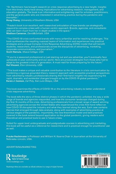"The COVID-19 crisis confronted brands with many unfamiliar and far-reaching challenges. This book synthesizes the resulting nuanced layers of information and experiences into practical strategies and a unique Complex Crisis Response Advertising (CCRA) model that will benefit students, researchers, and professionals across the disciples of advertising, marketing, corporate communications, and journalism."