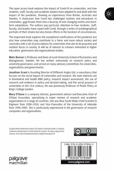 This open access book explores the impact of Covid-19 on universities, and how students, staff, faculty and academic leaders have adapted to and dealt with the impact of the pandemic. Drawing on experiences from Britain, Australia and Sweden, it showcases how Covid has challenged routines and procedures in universities, and thrown them into a disarray of ever-changing events and short-term adaptations. The authors pay particular attention to how students, staff, faculty, and leaders have coped with Covid, through a series of autobiographical portraits of their strains but also heroic efforts in the harshest of circumstances.
