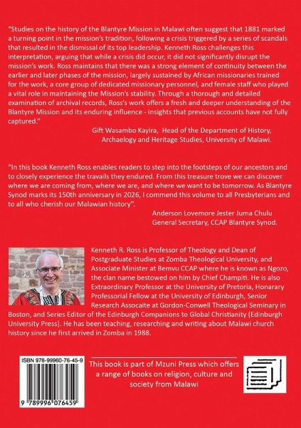 "Studies on the history of the Blantyre Mission in Malawi often suggest that 1881 marked a turning point in the mission's tradition, following a crisis triggered by a series of scandals that resulted in the dismissal of its top leadership. Kenneth Ross challenges this interpretation, arguing that while a crisis did occur, it did not significantly disrupt the mission's work. Ross maintains that there was a strong element of continuity between the earlier and later phases of the mission, largely sustained by African missionaries trained for the work, a core group of dedicated missionary personnel, and female staff who played a vital role in maintaining the Mission's stability. Through a thorough and detailed examination of archival records, Ross's work offers a fresh and deeper understanding of the Blantyre Mission and its enduring influence - insights that previous accounts have not fully captured." Gift Wasambo Kayira, Head of the Department of History, Archaelogy and Heritage Studies, University of Malawi. "In this book Kenneth Ross enables readers to step into the footsteps of our ancestors and to closely experience the travails they endured. From this treasure trove we can discover where we are coming from, where we are, and where we want to be tomorrow. As Blantyre Synod marks its 150th anniversary in 2026, I commend this volume to all Presbyterians and to all who cherish our Malawian history". Anderson Lovemore Jester Juma Chulu, General Secretary, CCAP Blantyre Synod.