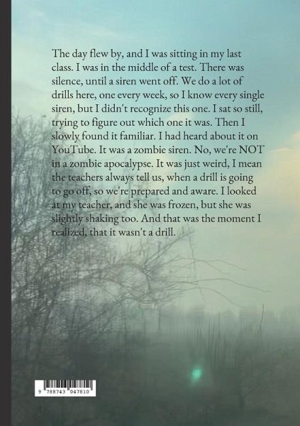 The day flew by, and I was sitting in my last class. I was in the middle of a test. There was silence, until a siren went off. We do a lot of drills here, one every week, so I know every single siren, but I didn't recognize this one. I sat so still, trying to figure out which one it was. Then I slowly found it familiar. I had heard about it on YouTube. It was a zombie siren. No, we're NOT in a zombie apocalypse. It was just weird, I mean the teachers always tell us, when a drill is going to go off, so we're prepared and aware. I looked at my teacher, and she was frozen, but she was slightly…mehr