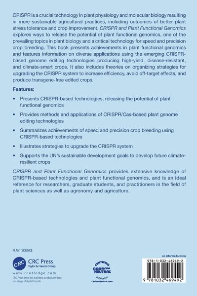 Features: Presents CRISPR-based technologies, releasing the potential of plant functional genomicsProvides methods and applications of CRISPR/Cas-based plant genome editing technologiesSummarizes achievements of speed and precision crop breeding using CRISPR-based technologiesIllustrates strategies to upgrade the CRISPR systemSupports the UN's sustainable development goals to develop future climate-resilient crops CRISPR and Plant Functional Genomics provides extensive knowledge of CRISPR-based technologies and plant functional genomics, and is an ideal reference for researchers, graduate students, and practitioners in the field of plant sciences as well as agronomy and agriculture.