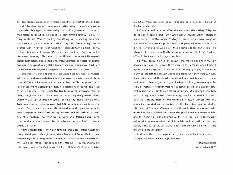 Take a deep dive into the shadows and light of one of the most subversive, corrosively funny, and beloved suspense thriller masterworks as author Stephen Rebello unravels for the very first time the tense and drama-filled story of the making Alfred Hitchcock's Strangers on a Train. As  entertaining as it is to watch Strangers on a Train, so too is the previously untold backstory that packs all the suspense, drama, and twists of a thriller. After all, what are the hallmarks of a great Hitchcock movie? A larger-than-life, complex cast of characters, each with something to prove, lose, or hide. Check. Tremendous risk, outsized conflict, and emotion as those men and women confront challenges off the set. Check. Feuds, deceptions, unlikely alliances, and double-crosses. Check. Coming off a 5-year-string of flops, Alfred Hitchcock gambled big on adapting Patricia Highsmith's debut novel, which critics called  “preposterous” and “unconvincing," in addition to “unsavory,” and “sick” (1950s code words for “gay” and “perverted”). Each step of the production was fraught with battles, but Hitchcock masterfully stayed two steps ahead of his opponents as he fought to bring his vision to life. Strangers on a Train became not only a creative high-water mark and box-office smash for Hitchcock, but also kicked off his unmatched decade of classics including Dial M for Murder, Rear Window, Vertigo, North by Northwest, and Psycho.   Richly documented, meticulously researched, and stylishly written, Criss-Cross is more than an authoritative film book. It is a portrait of an especially politically paranoid, misogynistic, and homophobic era in America, a time of dramatic transition in the entertainment industry, and a day of reckoning for Alfred Hitchcock and a few other talents with whom he made a dark, resonant, and prescient work of art.