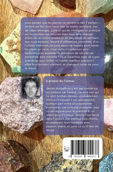 vous pensez que les pierres ne servent à rien ? parfait-ce livre est fait pour vous. pas de blabla mystique, pas de robes étranges, juste un guide intelligent et pratique sur les cristaux qui pourrait bien vous faire changer d'avis (ou au moins améliorer un peu votre vie pendant que vous essayez). bourré d'utilisations concrètes, d'un humour tranchant, et juste assez de science pour rester les pieds sur terre, c'est votre introduction sans fioritures pour exploiter la puissance de ces pierres anciennes. pire scénario ? vous repartirez avec de super anecdotes pour briller en soirée. meilleur scénario ? elles fonctionnent vraiment, et changent votre vie pour le mieux.