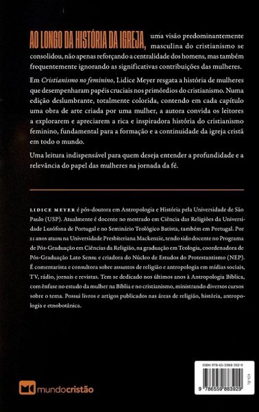 Ao longo da história da igreja, uma visão predominantemente masculina do cristianismo se consolidou, não apenas reforçando a centralidade dos homens, mas também frequentemente ignorando as significativas contribuições das mulheres. Em Cristianismo no feminino, Lidice Meyer resgata a história de mulheres que desempenharam papéis cruciais nos primórdios do cristianismo. Numa edição deslumbrante, totalmente colorida, contendo em cada capítulo uma obra de arte criada por uma mulher, a autora convida os leitores a explorarem e apreciarem a rica e inspiradora história do cristianismo feminino, fundamental para a formação e a continuidade da igreja cristã em todo o mundo. Uma leitura indispensável para quem deseja entender a profundidade e a relevância do papel das mulheres na jornada da fé.