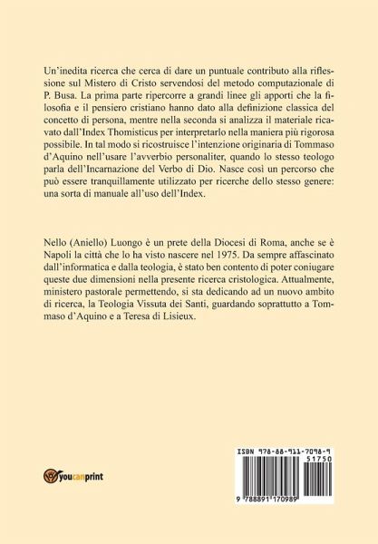 Un'inedita ricerca che cerca di dare un puntuale contributo alla riflessione sul Mistero di Cristo servendosi del metodo computazionale di P. Busa. La prima parte ripercorre a grandi linee gli apporti che la filosofia e il pensiero cristiano hanno dato alla definizione classica del concetto di persona, mentre nella seconda si analizza il materiale ricavato dall'Index Thomisticus per interpretarlo nella maniera più rigorosa possibile. In tal modo si ricostruisce l'intenzione originaria di Tommaso d'Aquino nell'usare l'avverbio personaliter, quando lo stesso teologo parla dell'Incarnazione del Verbo di Dio. Nasce così un percorso che può essere tranquillamente utilizzato per ricerche dello stesso genere: una sorta di manuale all'uso dell'Index.
