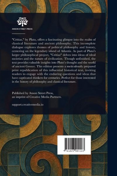 "Critias," by Plato, offers a fascinating glimpse into the realm of classical literature and ancient philosophy. This incomplete dialogue explores themes of political philosophy and history, centering on the legendary island of Atlantis. As part of Plato's larger philosophical project, "Critias" delves into ideas of ideal societies and the nature of civilization. Though unfinished, the text provides valuable insights into Plato's thought and the world of ancient Greece. This edition presents a meticulously prepared print republication of this influential historical text, inviting readers to engage with the enduring questions and ideas that have captivated thinkers for centuries. Perfect for those interested in the history of philosophy and classical literature. This work has been selected by scholars as being culturally important, and is part of the knowledge base of civilization as we know it. This work is in the public domain in the United States of America, and possibly other nations. Within the United States, you may freely copy and distribute this work, as no entity (individual or corporate) has a copyright on the body of the work. Scholars believe, and we concur, that this work is important enough to be preserved, reproduced, and made generally available to the public. We appreciate your support of the preservation process, and thank you for being an important part of keeping this knowledge alive and relevant.