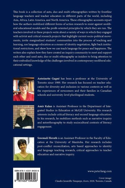This book is a collection of auto, duo and multi-ethnographies written by frontline language teachers and teacher educators in different parts of the world, including Asia, Africa, Latin America, and North America. These ethnographic accounts report how the authors mobilized different forms of action research to resist against neoliberal educational models and the profit-oriented principles by which they are run. The teachers involved in these projects write about a variety of ways in which they engaged with activist and critical research projects that highlight current socio-political movements, invite marginalized students' communities into the process of teaching and learning, use language education as a means of identity negotiation, fight back institutional restrictions, and show how we can teach language for peace and happiness. The writers also explain how they have created an inquiry community to meet and support each other and used auto, duo or multi-ethnography as insiders to bring attention to their embodied knowledge of the challenges involved in contemporary neoliberal educational settings.