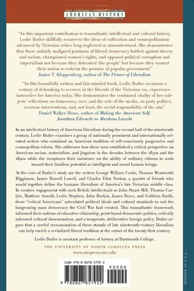 In this intellectual history of American liberalism during the second half of the nineteenth century, Leslie Butler examines a group of nationally prominent and internationally oriented writers who sustained an American tradition of self-consciously progressive and cosmopolitan reform. She addresses how these men established a critical perspective on American racism, materialism, and jingoism in the decades between the 1850s and the 1890s while she recaptures their insistence on the ability of ordinary citizens to work toward their limitless potential as intelligent and moral human beings. At the core of Butler's study are the writers George William Curtis, Thomas Wentworth Higginson, James Russell Lowell, and Charles Eliot Norton, a quartet of friends who would together define the humane liberalism of America's late Victorian middle class. In creative engagement with such British intellectuals as John Stuart Mill, Thomas Carlyle, Matthew Arnold, Leslie Stephen, John Ruskin, James Bryce, and Goldwin Smith, these "critical Americans" articulated political ideals and cultural standards to suit the burgeoning mass democracy the Civil War had created. This transatlantic framework informed their notions of educative citizenship, print-based democratic politics, critically informed cultural dissemination, and a temperate, deliberative foreign policy. Butler argues that a careful reexamination of these strands of late nineteenth-century liberalism can help enrich a revitalized liberal tradition at the outset of the twenty-first century.