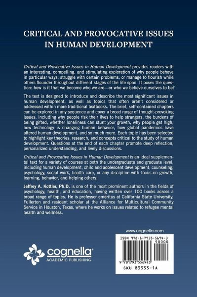 Critical and Provocative Issues in Human Development provides readers with an interesting, compelling, and stimulating exploration of why people behave in particular ways, struggle with certain problems, or manage to flourish while others flounder throughout different stages of the life span. It poses the question: how is it that we become who we are-or who we believe ourselves to be? The text is designed to introduce and describe the most significant issues in human development, as well as topics that often aren't considered or addressed within more traditional textbooks. The brief, self-contained chapters can be explored in any sequence and cover a broad range of thought-provoking issues, including why people risk their lives to help strangers, the burdens of being gifted, whether loneliness can stunt your growth, why people get high, how technology is changing human behavior, how global pandemics have altered human development, and so much more. Each topic has been selected to highlight key theories, research, and concepts critical to the study of human development. Questions at the end of each chapter promote deep reflection, personalized understanding, and lively discussions. Critical and Provocative Issues in Human Development is an ideal supplemental text for a variety of courses at both the undergraduate and graduate level, including human development, child and adolescent development, counseling, psychology, social work, health care, or any discipline with focus on growth, learning, behavior, and helping others.
