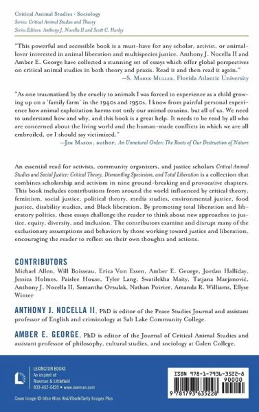 An essential read for activists, community organizers, and justice scholars Critical Animal Studies and Social Justice: Critical Theory, Dismantling Speciesism, and Total Liberation is a collection that combines scholarship and activism in nine ground-breaking and provocative chapters. The book includes contributions from around the world influenced by critical theory, feminism, social justice, political theory, media studies, environmental justice, food justice, disability studies, and Black liberation. By promoting total liberation and liberatory politics, these essays challenge the reader to think about new approaches to justice, equity, diversity, and inclusion. The contributors examine and disrupt many of the exclusionary assumptions and behaviors by those working toward justice and liberation, encouraging the reader to reflect on their own thoughts and actions.