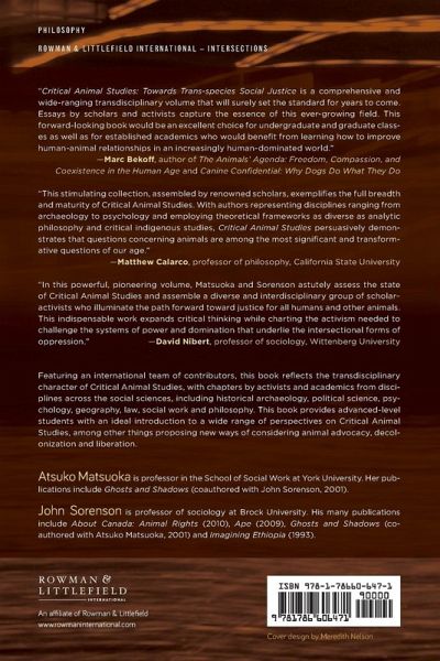 Introduction: Critical Animal Studies, Atsuko Matsuoka & John Sorenson / Part 1: Activism / 1. Animal Agency, Resistance, and Escape, Sarat Colling / 2. "Come closer, as close as you can... and try to help": Tolstoy, Bearing Witness and The Save Movement, Anita Krajnc & Ian Purdy / Part 2: Representing Animals / 3. Disengagement in Journalistic Discourse About Nonhuman Animals: An Analysis, Karen Davis / 4. Advertising oppression: The reproduction of anthroparchy on UK television, Matthew Cole and Kate Stewart / Part 3: New Disciplinary Advances / 5. Animal Emancipation and Historical Archaeology: A Pairing Long Overdue, Daniel Sayers & Justin Uehlein / 6. Political Animals? Finding Space for Animals in Contemporary Political Science, Paul Hamilton / 7. Making Space for Anarchist Geographies in Critical Animal Studies, Richard J. White and Simon Springer / 8. Psychological Implications of Undervaluing Animals: The Interspecies Model of Prejudice, Gordon Hodson & Kimberley Costello / Part 4: Animals and the Law / 9. Building a Better Legal Order for Animals: The Benefits of Beingness as an Alternative to Personhood in Rethinking Law's Response to Animals, Maneesha Deckha / 10. Posthumanist animal studies and zoöpolitical law, Krithika Srinavasan / Part 5: Philosophical Arguments/ 11. Animal Ethics and the New Materialism, Josephine Donovan / 12. Affectiveness and the nonhuman world: Examining the critique of empathy, Elisa Aaltola / 13. The Radical Potential of Analytic Animal Liberation Philosophy, Jason Wyckoff / Part 6: Indigeneity and Animal Rights / 14. The Roots of My Indigenous Veganism, Margaret Robinson / 15. Indigenous Worldviews and Critical Animal Studies: Decolonization and revealing truncated narratives of dominance, Ruth Koleszar-Green and Atsuko Matsuoka / Index
