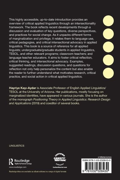 This highly accessible, up-to-date introduction provides an overview of critical applied linguistics through an intersectionality framework. The book reflects recent developments through a discussion and evaluation of key questions, diverse perspectives, and practices for social change. As it unpacks different forms of marginalization and privilege, it relates them to language use, critical pedagogies, and critical intersectional advocacy in applied linguistics. This book is a source of reference for all applied linguists; undergraduate/graduate students in applied linguistics, TESOL, and other relevant programs; classroom teachers; and language teacher educators. It aims to foster critical reflection, critical thinking, and intersectional advocacy. Examples, suggested readings, discussion questions, and questions for reflection not only help personalize the content but also enable the reader to further understand what motivates research, critical practice, and social action in critical applied linguistics.