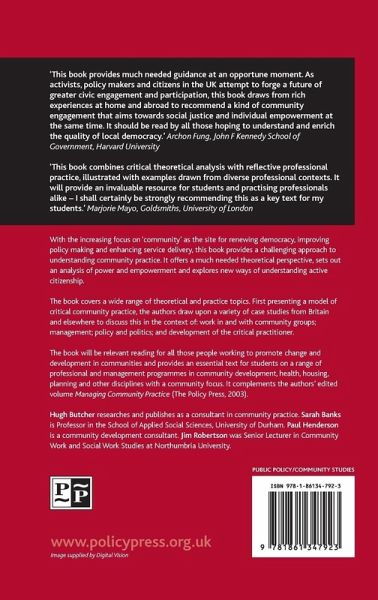 Hugh Butcher researches, writes and publishes as an independent consultant in the fields of community practice and higher education development. He has worked in community development, as a tutor in social policy, and in educational management and was, until recently, Head of Department of Applied Social Science and Humanities at Bradford College, West Yorkshire, UK. He contributed to, and co-edited Community and Public Policy and Managing Community Practice. Sarah Banks is Professor in the School of Applied Social Sciences, Durham University, UK. She teaches and researches in the fields of community practice and development, youth work and professional ethics. Her publications include Ethics and Values in Social Work; Ethics, Accountability and the Social Professions and edited collections: Managing Community Practice, Ethical Issues in Youth Work and Teaching Practical Ethics for the Social Professions. Paul Henderson is a consultant and writer on community development, having previously been Visiting Professor at De Montfort University, UK and Director of Practice Development at the Community Development Foundation. Co-authored publications include Skills in Neighbourhood Work and Social Exclusion and Community Development and the edited publication Managing Community Practice. He is a Trustee of the Joseph Rowntree Charitable Trust. Jim Robertson is a former Senior Lecturer in the School of Health, Community and Education Studies, Northumbria University. He is currently Chair of the Churches Community Work Alliance and is co-author of the publication Acting in Good Faith (2004) concerned with church-related community development. Current practice experience includes a management role in projects enabling community development learning in disadvantaged areas of North East England.