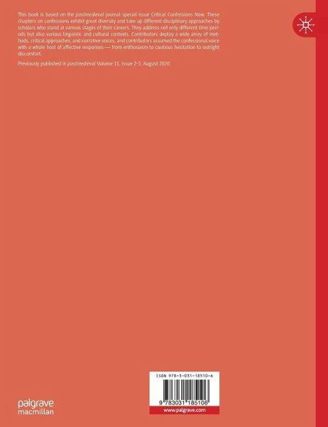 This book is based on the postmedieval journal special issue Critical Confessions Now. These chapters on confessions exhibit great diversity and take up different disciplinary approaches by scholars who stand at various stages of their careers. They address not only different time periods but also various linguistic and cultural contexts. Contributors deploy a wide array of methods, critical approaches, and narrative voices, and contributors assumed the confessional voice with a whole host of affective responses - from enthusiasm to cautious hesitation to outright discomfort. Previously published in postmedieval Volume 11, issue 2-3, August 2020.…mehr