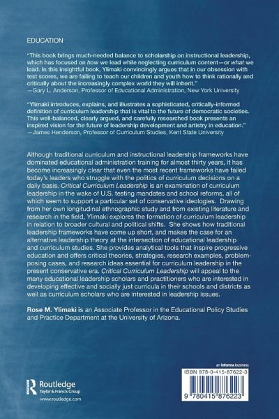 Although traditional curriculum and instructional leadership frameworks have dominated educational administration training for almost thirty years, it has become increasingly clear that even the most recent frameworks have failed today's leaders who struggle with the politics of curriculum decisions on a daily basis. Critical Curriculum Leadership is an examination of curriculum leadership in the wake of U.S. testing mandates and school reforms, all of which seem to support a particular set of conservative ideologies. Drawing from her own longitudinal ethnographic study and from existing literature and research in the field, Ylimaki explores the formation of curriculum leadership in relation to broader cultural and political shifts. She shows how traditional leadership frameworks have come up short, and makes the case for an alternative leadership theory at the intersection of educational leadership and curriculum studies. She provides analytical tools that inspire progressive education and offers critical theories, strategies, research examples, problem-posing cases, and research ideas essential for curriculum leadership in the present conservative era. Critical Curriculum Leadership will appeal to the many educational leadership scholars and practitioners who are interested in developing effective and socially just curricula in their schools and districts as well as curriculum scholars who are interested in leadership issues.