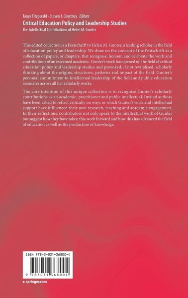 This edited collection is a Festschrift to Helen M. Gunter, a leading scholar in the field of education policy and leadership. We draw on the concept of the Festschrift as a collection of papers, or chapters, that recognise, honour, and celebrate the work and contributions of an esteemed academic. Gunter's work has opened up the field of critical education policy and leadership studies and provoked, if not revitalised, scholarly thinking about the origins, structures, patterns and impact of the field. Gunter's personal commitment to intellectual leadership of the field and public education resonates across all her scholarly works.