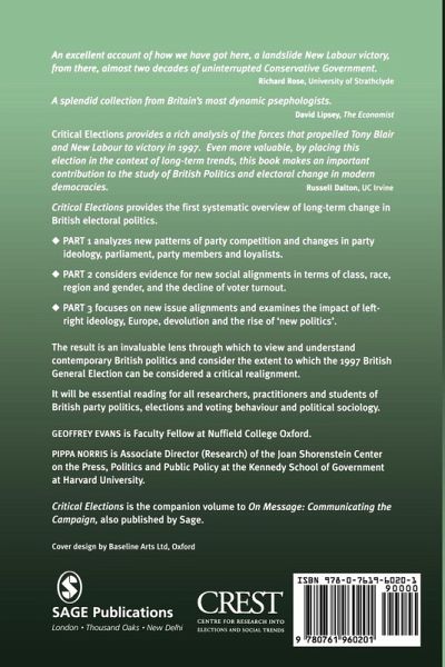 `Critical Elections assembles the leading scholars of British electoral politics to provide a rich analysis of the forces that propelled Tony Blair and New Labour to victory in 1997. Even more valuable, by placing this election in the context of long-term trends, this book makes an important contribution to the study of British politics and electoral change in modern democracies. While it is yet unclear whether 1997 represents a critical election, it is certain that this book should be considered critical reading for scholars in the field' - Russell Dalton, UC Irvine