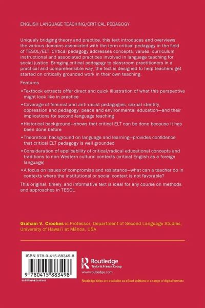 Uniquely bridging theory and practice, this text introduces and overviews the various domains associated with the term critical pedagogy in the field of TESOL/ELT. Critical pedagogy addresses concepts, values, curriculum, instructional and associated practices involved in language teaching for social justice. Bringing critical pedagogy to classroom practitioners in a practical and comprehensible way, the text is designed to help teachers get started on critically grounded work in their own teaching. Features ¿ Textbook extracts offer direct and quick illustration of what this perspective might look like in practice ¿ Coverage of feminist and anti-racist pedagogies; sexual identity, oppression and pedagogy; peace and environmental education; and critical English as a foreign language-and their implications for second-language teaching ¿ Historical background ¿ Theoretical background on language and learning ¿ Consideration of applicability of critical/radical educational concepts and traditions to non-Western cultural contexts ¿ A focus on issues of compromise and resistance This original, timely, and informative text is ideal for any course on methods and approaches in TESOL.