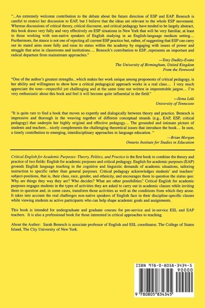 Brings together two fields: English for Academic Purposes (EAP) & Critical Pedagogy, with the goal of connecting the world outside the classroom to the academic coursework within. Presents the theory & practice of Critical EAP, and four in-depth examples