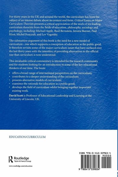 This book is a critical appreciation of the work of sixteen leading curriculum theorists, taking account of the writings of a balance of established thinkers and curriculum analysts from the fields of education, philosophy, sociology and psychology. Together these commentators offer a broad perspective with views from the UK, the US and Europe, and from a range of political stances ranging from radical conservatism through liberalism to socialism and libertarianism. The theorists include major names such as Lev Vygotsky, Jerome Bruner, Maxine Greene, Basil Bernstein, Micheal Foucault, Elliott Eisner, John White, Michael Apple and more. Ideal for students on all teacher training courses looking for an introduction to some of the key educational thinkers of our time, this key text can also be used as a companion volume to the Routledge four-volume set on curriculum theory.
