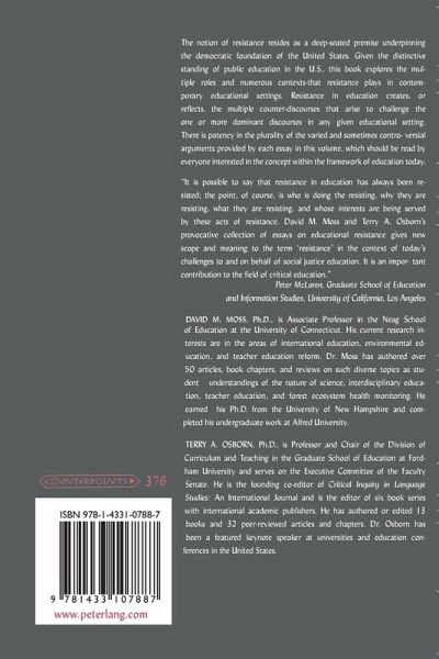 «It is possible to say that resistance in education has always been resisted; the point, of course, is who is doing the resisting, why they are resisting, what they are resisting, and whose interests are being served by these acts of resistance. David M. Moss and Terry A. Osborn's provocative collection of essays on educational resistance gives new scope and meaning to the term 'resistance' in the context of today's challenges to and on behalf of social justice education. It is an important contribution to the field of critical education.» (Peter McLaren, Graduate School of Education and Information Studies, University of California, Los Angeles)