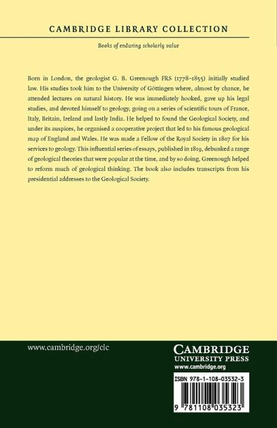 Born in London, the geologist G. B. Greenough FRS (1778-1855) initially studied law. His studies took him to the University of Göttingen where, almost by chance, he attended lectures on natural history. He was immediately hooked, gave up his legal studies, and devoted himself to geology, going on a series of scientific tours of France, Italy, Britain, Ireland and lastly India. He helped to found the Geological Society, and under its auspices, he organised a cooperative project that led to his famous geological map of England and Wales. He was made a Fellow of the Royal Society in 1807 for his services to geology. This influential series of essays, published in 1819, debunked a range of geological theories that were popular at the time, and by so doing, Greenough helped to reform much of geological thinking. The book also includes transcripts from his presidential addresses to the Geological Society.