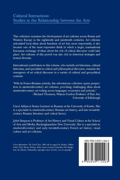 Contents: Carol Adlam/Juliet Simpson: Introduction. Critical Exchanges: Artwriting in Eighteenth- and Nineteenth-Century Europe - Andy Hamilton: Criticism, Connoisseurship and Appreciation - Katerina Deligiorgi: The Convergence of Ethics and Aesthetics: Schiller's Concept of the 'Naive' and Objects of Distant Antiquity - Richard Wrigley: Sense of Place in Eighteenth-Century Salon Criticism - Juliet Simpson: Relative Values? Ideas of 'Real' and 'Symbolic' Worth in Fin-de-Siècle French Art Criticism - Aaron J. Cohen: Profession or Politics? Modernism and the Rhetoric of Art Criticism in Late Imperial Russia, 1898-1917 - Claudia Mattos: The Torchlight Visit: Guiding the Eye through Late Eighteenth and Early Nineteenth-Century Antique Sculpture Galleries - Debbie Challis: Charles Newton and the British Museum: Articulating a Science of Ancient Art in the Nineteenth Century - Meaghan Clarke: Translating nudus: Modernity and the British Academy's New Clothes - Marijke Jonker: La Font de Saint-Yenne: Jansenism and the Beginnings of Independent Art Criticism in France - Alexey Makhrov: Defining Art Criticism in Nineteenth-Century Russia: Vladimir Stasov as Independent Critic - Elizabeth Kridl Valkenier: Ilia Repin and His Critics - Antonia Napp: Johann Buhle's Zhurnal iziashchnykh iskusstv: The German Source of Russian Art Criticism - Rosalind P. Blakesley: Emile Zola's Art Criticism in Russia - Ilia Dorontchenkov: Between Isolation and Drang nach Westen: Russian Criticism and Modern Western Art around 1900 - Emma Minns: 'New, Strange, and Beautiful to English Eyes': British Reviews of Representations of Russia at the Beginning of the Twentieth Century - Yves Landerouin: Ruskin, Whistler, Wilde, Proust: The Dispute about Creative Criticism - Helen Bridge: Rilke's Neue Gedichte and the Visual Arts.