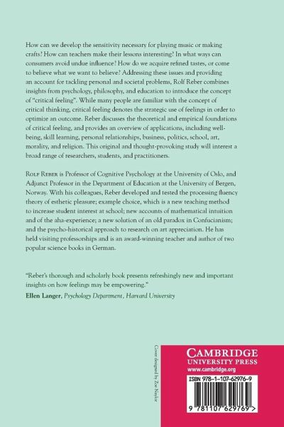 How can we develop the sensitivity necessary for playing music or making crafts? How can teachers make their lessons interesting? In what ways can consumers avoid undue influence? How do we acquire refined tastes, or come to believe what we want to believe? Addressing these issues and providing an account for tackling personal and societal problems, Rolf Reber combines insights from psychology, philosophy, and education to introduce the concept of 'critical feeling'. While many people are familiar with the concept of critical thinking, critical feeling denotes the strategic use of feelings in order to optimize an outcome. Reber discusses the theoretical and empirical foundations of critical feeling and provides an overview of applications, including well-being, skill learning, personal relationships, business, politics, school, art, morality, and religion. This original and thought-provoking study will interest a broad range of researchers, students, and practitioners.