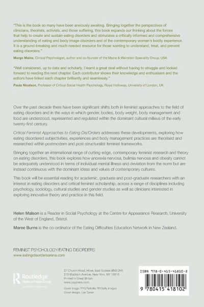 Katzman Foreword. Malson Burns Re-Theorising the Slash of Dis/Order: An Introduction to Critical Feminist Approaches to Eating Dis/Orders. Part 1. Theorising Eating Dis/Orders in a Changing World. Eckermann Theorising Self-Starvation: Beyond Risk Governmentality and the Normalizing Gaze. Sayers Feeding the Body. Gard Understanding Obesity by Understanding Desire. Bordo Not Just 'A White Girl's Thing': The Changing Face of Food and Body Image Problems. Part 2. Interrogating Cultural Contexts of Dis/Ordered Eating. Saukko A Critical Discussion of Normativity in Discourses on Eating Disorders. Nasser Malson Beyond Western Dis/Orders: Thinness and Self-Starvation of Other-ED Women. Day Keys Anorexia/Bulimia as Resistance and Conformity in Pro-Ana and Pro-Mia Virtual Conversations. Rice How Big Girls Become Fat Girls: The Cultural Production of Problem Eating and Physical Inactivity. Part 3. In/Visible Bodies and Embodiment. Probyn Fat Feelings Bodies: A Critical Approach to Obesity. Burns Bodies as (Im)Material? Bulimia and Body Image Discourse. Malson Appearing to Disappear: Postmodern Femininities and Self-Starved Subjectivities. LeBesco Weight Management Good Health and the Will to Normality. Part 4. Critiquing the Discourses and Discursive Practices of Treatment. Surtees Food for Thought: Embodied Slimness and Nursing Within an Eating Disorders Unit. Moulding The Anorexic as Femme Fatale: Reproducing Gender Through the Father/Psychiatrist-Daughter/Patient Relationship. Throsby 'There's Something in My Brain that Doesn't Work Properly': Weight Loss Surgery and the Medicalisation of Obesity. Guilfoyle Therapeutic Discourse and Eating Disorders in the Context of Power. Part 5. Critical Interventions. Epston Maisel Anti-Anorexia/Bulimia: A Polemics of Life And Death. Burns Tyrer The Eating Difficulties Education Network (EDEN) Feminisms in Practice: Challenges and Opportunities for an Eating Issues Community Agency. Treadgold Treadgold Treadgold Rediscovering a Daughter. Gremillion Complexities of Power and Meaning: A Reflection on Parts IV And V.