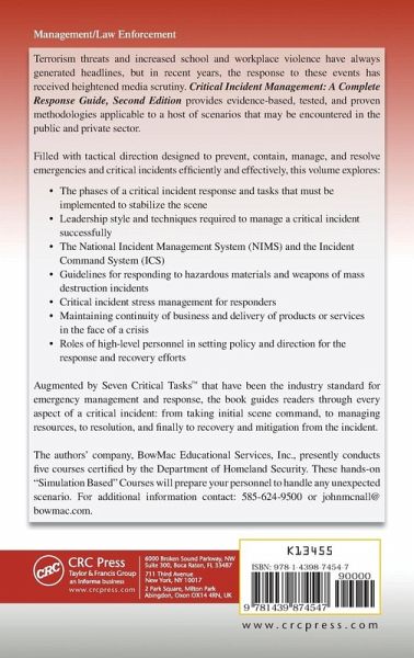Terrorism threats and increased school and workplace violence have always generated headlines, but in recent years, the response to these events has received heightened media scrutiny. Critical Incident Management: A Complete Resource Guide, Second Edition provides evidence-based, tested, and proven methodologies applicable to a host of scenarios that may be encountered in the public and private sector. Filled with tactical direction designed to prevent, contain, manage, and resolve emergencies and critical incidents efficiently and effectively, this volume explores: The phases of a critical incident response and tasks that must be implemented to stabilize the scene Leadership style and techniques required to manage a critical incident successfully The National Incident Management System (NIMS) and the Incident Command System (ICS) Guidelines for responding to hazardous materials and weapons of mass destruction incidents Critical incident stress management for responders Maintaining continuity of business and delivery of products or services in the face of a crisis Roles of high-level personnel in setting policy and direction for the response and recovery efforts Augmented by Seven Critical Tasks¿ that have been the industry standard for emergency management and response, the book guides readers through every aspect of a critical incident: from taking initial scene command, to managing resources, to resolution, and finally to recovery and mitigation from the incident. The authors' company, BowMac Educational Services, Inc., presently conducts five courses certified by the Department of Homeland Security. These hands-on "Simulation Based" Courses will prepare your personnel to handle any unexpected scenario. For additional information contact: 585-624-9500 or johnmcnall@bowmac.com.