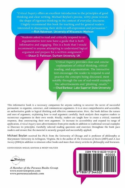 This informative book is a necessary companion for anyone seeking to uncover the secret of successful persuasion: to organize, construct, and communicate arguments. It is at once comprehensive and accessible, an authoritative guide to logical thinking and effective communication. First, the text defines the nature and uses of argument, explaining how to read argument carefully. Such analysis then requires the student to reconstruct arguments in his or her own words. Finally, the reader is taught how to create a critical, reasoned response, thus constructing his or her own argument. To increase its accessibility and expand its range of application, Critical Inquiry uses (in addition to textual examples) advertisements from print media as 'texts' for applying its principles to subjects outside the traditional mode of academic presentation. Throughout, carefully selected reading questions and exercises pace the reader and ensure that the material is securely grasped and successfully applied.