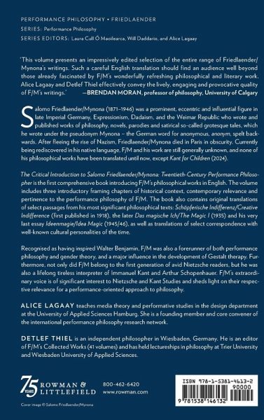 Salomo Friedlaender/Mynona (1871-1946) was a prominent, eccentric and influential figure in late Imperial Germany, Expressionism, Dadaism, and the Weimar Republic. He wrote and published works of philosophy, novels, parodies and satirical so-called grotesque tales, which he wrote under the pseudonym "Mynona"-the German word for anonymous, anonym, spelled backwards. Currently being rediscovered in his native language, F/M and his work are still generally unknown, and none of his philosophical texts have been translated. The Critical Introduction to Salomo Friedlaender/Mynona: Twentieth-Century Performance Philosopher is the first English book introducing F/M's philosophical works. The volume includes three introductory framing chapters of historical context, contemporary relevance and pertinence to the performance philosophy of F/M. The book also contains original translations of select passages from his most significant philosophical texts: Schöpferische Indifferenz/Creative Indifference, (first published in 1918), the later Das magische Ich/The Magic I (1935) and his very last essay Ideenmagie/Idea Magic (1945/46), as well as translations of select correspondence with well-known cultural personalities of the time. Recognised as having inspired Walter Benjamin, F/M was also a forerunner of both performance philosophy and gender theory, and a major influence in the development of Gestalt therapy. Furthermore, not only did F/M belong to the first generation of avid Nietzsche readers, but he was also a lifelong tireless interpreter of Immanuel Kant and Schopenhauer. F/M's extraordinary voice is of significant interest to Nietzsche and Kant Studies and sheds light on their respective relevance for a performance-oriented approach to philosophy.