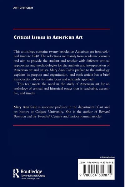 This anthology of essays on different critical approaches and methodologies for the analysis and interpretation of American art and artists is designed for students and teachers in American art history and American studies programs. It contains twenty selections from academic journals on American art from colonial times to 1940. Mary Ann Calo provides an introduction to the anthology, explaining its purpose and organization, and each selection has a brief introduction about its main focus and scholarly approach. These case studies show the diversity of scholarly thinking about interpreting American works of art, which should be useful for teachers and comprehensible and interesting for students.This anthology contains twenty articles on American art from colonial times to 1940. The selections are mainly from academic journals and aim to provide the student and teacher with different critical approaches and methodologies for the analysis and interpretation of American art and artists. Mary Ann Calo's preface to the anthology explains its purpose and organization, and each article will have a brief introduction about its main focus and scholarly approach.This text meets the need in American art history studies for an anthology of essays on critical approaches and methodologies.