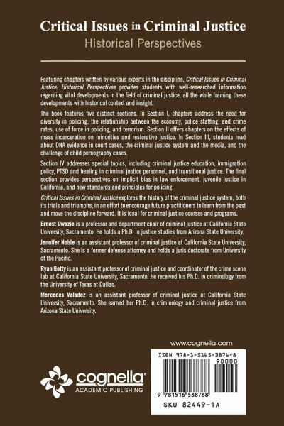 Featuring chapters written by various experts in the discipline, Critical Issues in Criminal Justice: Historical Perspectives provides students with well-researched information regarding vital developments in the field of criminal justice, all the while framing these developments with historical context and insight. The book features five distinct sections. In Section I, chapters address the need for diversity in policing, the relationship between the economy, police staffing, and crime rates, use of force in policing, and terrorism. Section II offers chapters on the effects of mass incarceration on minorities and restorative justice. In Section III, students read about DNA evidence in court cases, the criminal justice system and the media, and the challenge of child pornography cases. Section IV addresses special topics, including criminal justice education, immigration policy, PTSD and healing in criminal justice personnel, and transitional justice. The final section provides perspectives on implicit bias in law enforcement, juvenile justice in California, and new standards and principles for policing. Critical Issues in Criminal Justice explores the history of the criminal justice system, both its trials and triumphs, in an effort to encourage future practitioners to learn from the past and move the discipline forward. It is ideal for criminal justice courses and programs. Ernest Uwazie is a professor and department chair of criminal justice at California State University, Sacramento. He holds a Ph.D. in justice studies from Arizona State University. Ryan Getty is an assistant professor of criminal justice and coordinator of the crime scene lab at California State University, Sacramento. He received his Ph.D. in criminology from the University of Texas at Dallas. Mercedes Valadez is an assistant professor of criminal justice at California State University, Sacramento. She earned her Ph.D. in criminology and criminal justice from Arizona State University. Jennifer Noble is an assistant professor of criminal justice at California State University, Sacramento. She is a former defense attorney and holds a juris doctorate from University of the Pacific.