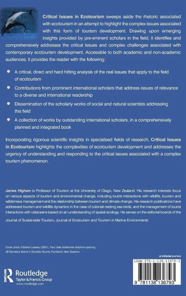 1 - Ecotourism: Competing and conflicting schools of thought by James Higham; Part I. Generic issues in ecotourism; 2 - Definition paradoxes: From concept to definition by Peter Björk; 3 - Ecotourism as a western construct by Erlet Cater; 4 - Ecotourism and Global Environmental Change by Stefan Gössling; 5 - Ecotourism, energy use and the global climate - widening the local perspective by Susanne Becken and Matthias Schellhorn; 6 - Ecotourism and biosecurity by C. Michael Hall.; 7 - Ecotourism: Pondering the paradoxes by James Higham and Michael Lûck; 8 - Against the current: Striving for ethical ecotourism by Agnes Nowaczek, Cesar Moran-Cahusac and David Fennell; 9 - The role of sustainable tourism in international development: Prospects for economic growth, alleviation of poverty, and environmental conservation by Megan Epler Wood; 10 - Ecotourism and gender issues by Regina Scheyvens; 11 - Ecotourism, CSR, and the fourth dimension of sustainability by Pam Wight; Part II. Critical issues in ecotourism policy, planning and management; 12 - Scaling Ecotourism: The role of scale in understanding the impacts of ecotourism by C. Michael Hall; 13 - Defining critical habitats: The spatio-ecological approach to managing tourism-wildlife interactions by James Higham and David Lusseau; 14 - Ecotourism and wildlife habituation by Eric Shelton and James Higham; 15 - Ecotourism and biodiversity conservation in Asia: Institutional challenges and opportunities by Janet Cochrane; 16 - Indigenous ecotourism: Conservation and resource rights by Heather Zeppel; 17 - Indigenous perspectives on ecotourism in Nepal: The Ghale Kharka-Sikles and Sirubari experience by Sanjay K. Nepal; 18 - China: Ecotourism and cultural tourism: Harmony or dissonance? By Trevor Sofield; 19 - Ecotourism certification: Potential and challenges by Xavier Font; 20 - Negotiating the obstacles: Owner/operator perspectives on 'nature' tourism in New Zealand by Anna Carr; 21 - Critical issues in ecotourism: Which school of thought should prevail? By James Higham