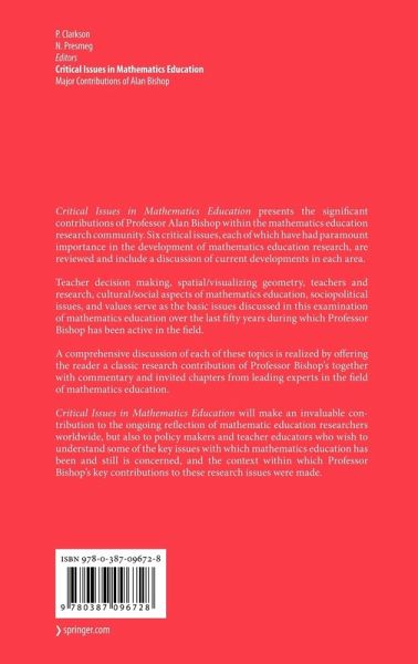 Critical Issues in Mathematics Educationwill make an invaluable contribution to the ongoing reflection of mathematic education researchers worldwide, but also to policy makers and teacher educators who wish to understand some of the key issues with which mathematics education has been and still is concerned, and the context within which Professor Bishop's key contributions to these research issues were made.