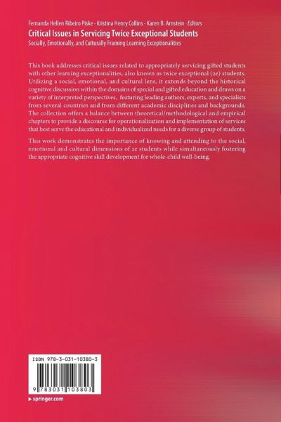 This book addresses critical issues related to appropriately servicing gifted students with other learning exceptionalities, also known as twice exceptional (2e) students. Utilizing a social, emotional, and cultural lens, it extends beyond the historical cognitive discussion within the domains of special and gifted education and draws on a variety of interpreted perspectives, featuring leading authors, experts, and specialists from several countries and from different academic disciplines and backgrounds. The collection offers a balance between theoretical/methodological and empirical chapters to provide a discourse for operationalization and implementation of services that best serve the educational and individualized needs for a diverse group of students.