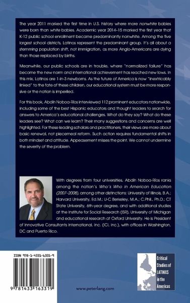 For this book, Abdín Noboa-Ríos interviewed 112 prominent educators nationwide, including some of the best Hispanic educators and thought leaders to search for answers to America's educational challenges. What do they say? What do these leaders see? What can we learn? Their many suggestions and concerns are well highlighted. For these leading scholars and practitioners, their views are more about basic renewal, not piecemeal reform. Such action requires fundamental shifts in both mindset and attitude. Appeasement misses the point. We cannot undermine the severity of the problem.