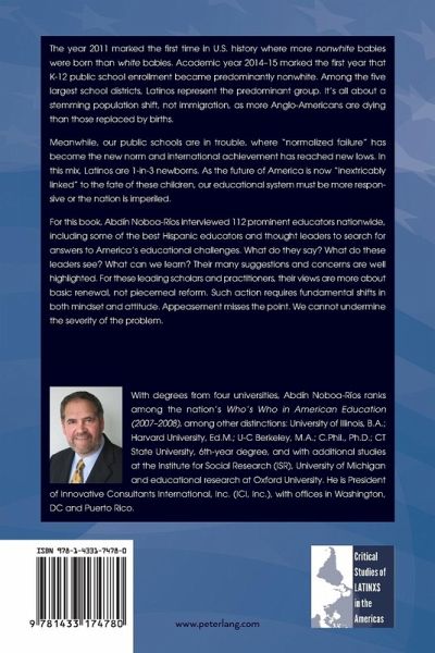 For this book, Abdín Noboa-Ríos interviewed 112 prominent educators nationwide, including some of the best Hispanic educators and thought leaders to search for answers to America's educational challenges. What do they say? What do these leaders see? What can we learn? Their many suggestions and concerns are well highlighted. For these leading scholars and practitioners, their views are more about basic renewal, not piecemeal reform. Such action requires fundamental shifts in both mindset and attitude. Appeasement misses the point. We cannot undermine the severity of the problem.