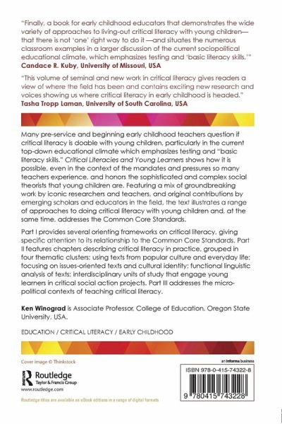 Many pre-service and beginning early childhood teachers question if critical literacy is do-able with young children, particularly in the current top-down educational climate. Critical Literacies and Young Learners shows how it is possible, even in the context of the mandates and pressures so many teachers experience, and honors the sophisticated and complex social theorists that young children are. Featuring a mix of groundbreaking work by iconic researchers and teachers and original contributions by emerging scholars and educators in the field, the text illustrates a range of approaches to doing critical literacy with young children and, at the same time, addresses the Common Core Standards. Part I provides several orienting frameworks on critical literacy, giving specific attention to its relationship to the Common Core Standards. Part II features chapters describing critical literacy in practice, grouped in 4 thematic clusters: using texts from popular culture and everyday life; focusing on issues-oriented texts and cultural identity; functional linguistic analysis of texts; interdisciplinary that engage young learners in critical social action projects. Part III addresses the micro-political contexts of teaching critical literacy.